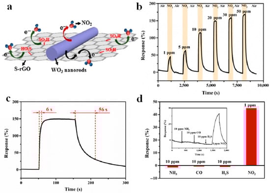 In this case, sensing performance towards 1–50 ppm has been demonstrated (Figure 12b). The optimized S-rGO/WO3-based sensor showed a high and fast (6 s) sensitivity (149%) to 20 ppm NO2 and a short recovery time (56 s) (Figure 12c). Furthermore, enhanced reproducibility, selectivity, and fast recovery kinetics can be also observed (Figure 12d). The enhanced sensing mechanism can be ascribed to the following three factors: firstly, the Schottky-junction formed in S-rGO/WO3 nanocomposites could provide more active sites to capture electrons. Then, the chemical bonding achieved via C–O–W bonds formed between S-rGO and WO3 can be regarded as a charge transport bridge in the gas sensing process, which significantly enhances the charge transfer efficiency, resulting in the high sensitivity and fast response [79,106]. Thirdly, the sulfonate acid groups in rGO could not only prevent the agglomeration of rGO leading to a high specific surface area for efficient gas adsorption and diffusion, but also selectively absorb NO2 molecules, resulting in the enhancing sensitivity and selectivity of the composites [106,110,111].
