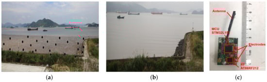 The illustration of the intertidal wireless sensor network in Zhoushan. (a) Nodes deployment with low tide in Zhoushan; (b) High tide in Zhoushan, all nodes are submerged; (c) The hardware design of the sensor node.