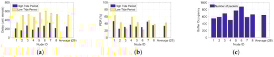 The delay, PDR and buffer condition in an IT-WSN in Zhoushan, China. We evaluate the average delay and PDR of all 26 nodes (“Average (26)”) in the Zhoushan system, and we select eight nodes (Node 1–Node 8) as representatives. (a) The average delay of 8 nodes and the average delay of all nodes in Zhoushan experiment during high tide period and low tide period; (b) The average PDR of 8 nodes and the average PDR of all nodes in Zhoushan experiment during high tide period and low tide period; (c) The average buffer occupancy of 8 nodes and the average buffer occupancy of all nodes in Zhoushan experiment.