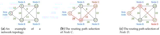 Pido selects the routing path with the least end-to-end delay and Figure 4 is an example of routing selection in Pido . Figure 4a is a typical network with four nodes and a sink node, and each node attempts to select a routing path to the sink node with the least end-to-end delay. The numbers in circles represent the node delays and the numbers on dash lines are link delays. Figure 4b,c reveal the routing paths for and . Both and have three candidate parents, and they select and as parents individually, which have the least end-to-end delay.