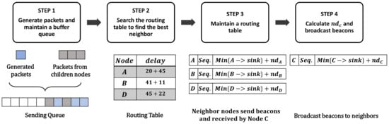 - Step 4: The node activates self-check to calculate the process capability and buffer status, and broadcasts beacons periodically to announce the delay from itself to the sink () to neighbors.