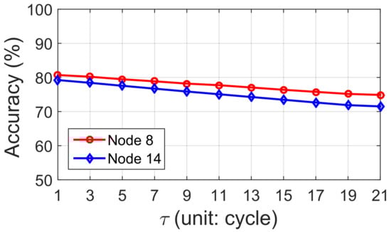 For a , obtaining its status directly seems to be impossible when . Though tidal periodicity can be utilized for roughly predicting node status, the prediction result is not good enough for route selection. To validate our conclusion, we randomly select two nodes (node 8 and node 14) in our Zhoushan system and predict the node status with only tidal periodicity. We compare the prediction status with the real trace we collected in the field test, and results are shown in Figure 6. In Figure 6, the accuracy of predicting node status at the next cycle () is only around 80%, and the accuracy is even decreasing for further prediction (). Remember that nodes only have two states: above-water and under-water, and thus utilizing tidal periodicity alone is not ideal.