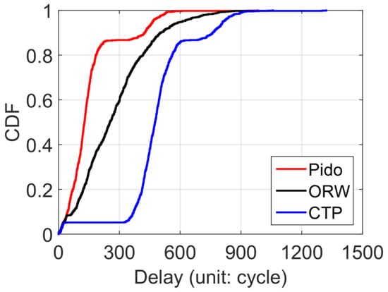 The delay distribution of Pido , ORW and CTP (network size: 225; average under-water time: 360 cycles).
