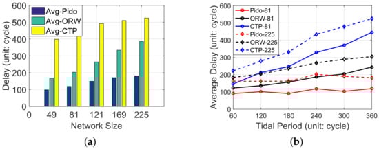 The average delay of Pido , ORW and CTP in different scenarios: network sizes and tidal periods. (a) The average delay of Pido , ORW and CTP in different network size (average under-water time: 360 cycles); (b) The average delay of Pido , ORW and CTP with different system tidal periods (network sizes are 81 and 225).