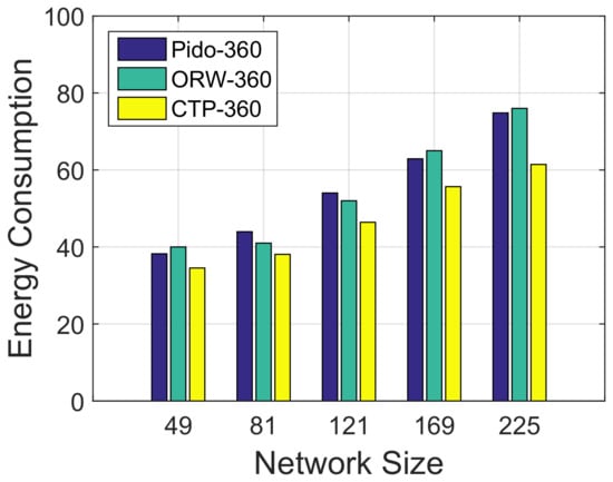 Energy consumption with Pido , ORW and CTP in different network sizes (average under-water time: 360 cycles).