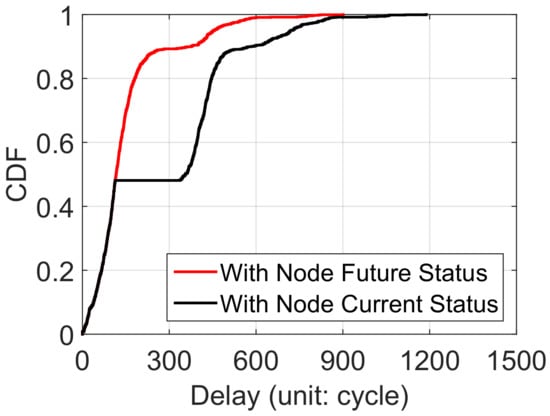 The delay distribution of Pido with future node status and current node status (network size: 225; average under-water time: 360 cycles).