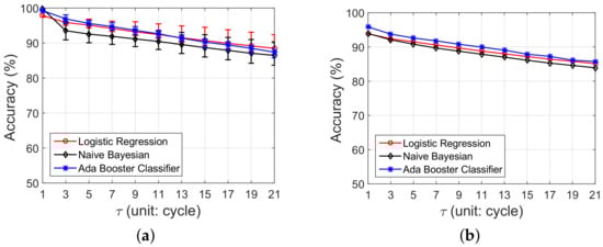 For the sake of efficiency, we utilize a classifier for the prediction of , and compare three common classification algorithms: Logistic Regression [31], Ada Boost Classifier [32] and Gaussian Naive Bayesian [33]. Logistic Regression is an implementation-friendly algorithm, which is extremely lightweight in both time and space. Ada Boost Classifier utilizes several weak classifiers to vote for the result, and generally performs well in many classification cases. On the other hand, Ada Boost Classifier is too sensitive to the outliers, which means it may easily lead to over-fitting. Gaussian Naive Bayesian is one of the simplest classification algorithm and can perform well when the data fits Gaussian distribution. The detail of these three algorithms can be referred in [31,32,33]. The comparison of these three algorithms will be stated in Section 4.4. The model is defined as: