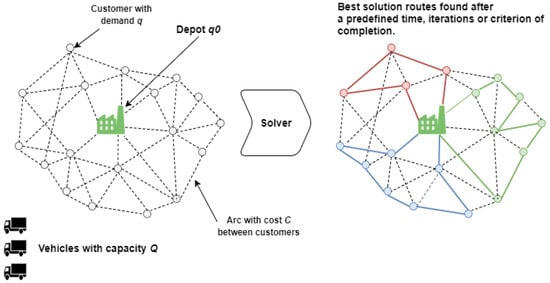 Regarding the solution, VRP and its derivatives are NP-hard problems, which means that the bigger the problem is, the greater the computational complexity to resolve it becomes. There are several solution-searching methods for these problems in the literature [62], such as (1) exact approaches which explore exhaustively explore the search space until the best solution is found. These can be branch and bound [63] or branch cut and price [64]. (2) Heuristic methods perform a limited exploration of the search space and usually deliver good quality results in small computing times [65] and (3) meta Heuristic methods are generic methods of exploration in the solution space for searching and optimization problems. These methods provide a design line adaptable to each context, and they can generate more efficient algorithms. These algorithms—Ant algorithms [66], Constraint Programming [67,68], Genetic Algorithms [69] and Tabu Search [70,71], among others—usually work better than heuristic methods.