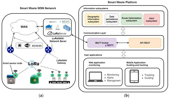 Main diagram of the system’s architecture. Wireless Sensors Network (WSN) of smart developed sensors (a) and the diagram of the information systems, communication and user applications (b).