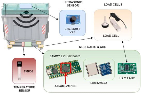 The proposed node uses the container frames as the supporting platform. Figure 4 shows the location of every module (previously mentioned) inside the container, and sensors and microcontrollers are employed on each module. The device frame with the MCU, the temperature sensor, and the radio module are located in the lower section, and load cells measuring waste weight are located in the container legs. The only element located in the upper section of the container is the ultrasonic sensor measuring the estimated volume of waste.