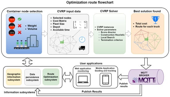 - CVRP solver: this is executed with previously indicated data in the route optimization subsystem. The heuristic construction of the solution and the algorithm of the local search are applied until the stop criteria is reached. A benchmark is employed to select the fastest optimization algorithm that can be used to obtain a feasible solution during the indicated time. Different construction heuristics are used for different local searches.