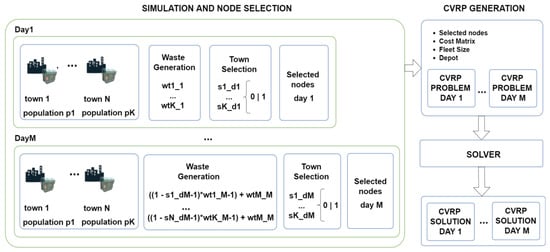 - Node selection: nodes visited by the waste collection fleet are selected. The criteria selection of nodes depends on the sensor variables at that moment—the weight and volume of each container. A threshold will be established to select the nodes that must be collected. This will depend on variables, such as current regulations of the town where the system is deployed [85] as well as waste intended to be collected. This is the reason why the criteria will change depending on the specific case study. When specifying the threshold, the following factors should be considered: filling frequency, data availability in the system and whether a criterion should be established or not, in accordance with the last waste report from the town. The criteria applied in this case study will be further explained later.