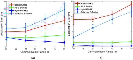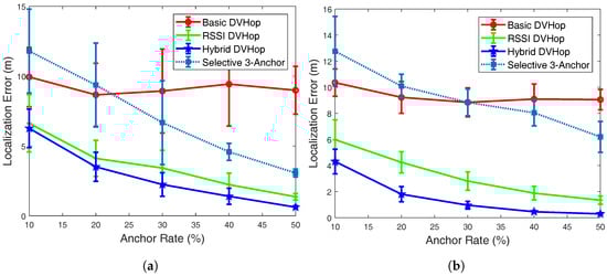 Localization error vs. transmission range. (a) Anchors Rate = 10%; (b) Anchors Rate = 50%.