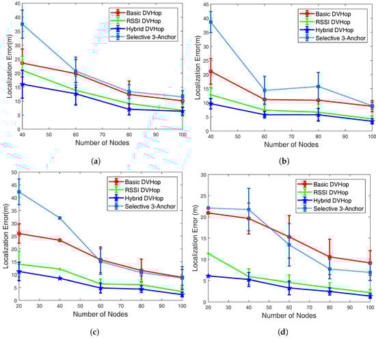 Localization error vs Number of nodes. (a) Anchor Rate = 10%; (b) Anchor Rate = 20%; (c) Anchor Rate = 30%; (d) Anchor Rate = 40%.