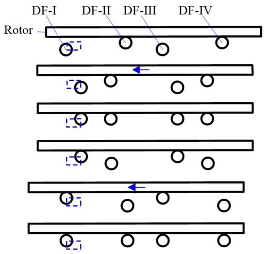 - DF-I and DF-III bend rightward, DF-II and DF-IV bend leftward synchronously and push the rotor leftward for one step.