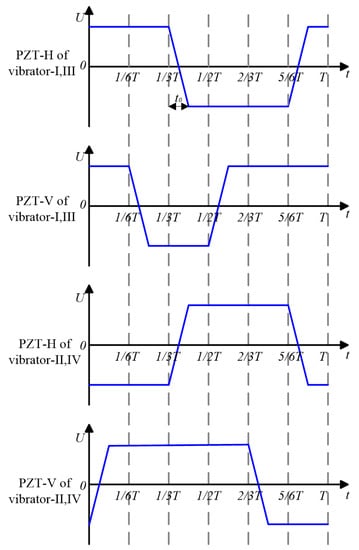 Therefore, the driving feet will move along rectangular motion trajectories with special temporal shifts and the rotor will be pushed leftward for two steps in one cycle. A large stroke can be accomplished through the accumulations of small steps. Four driving signals are needed to achieve the above motion sequences: the two signals applied on the PZT elements of vibrator-I and vibrator-III are the same, so as the two signals applied on the PZT elements of vibrator-II and vibrator-IV, as shown in Figure 3. Here, T is the time of one cycle; t0 is the transitional time during the variation process of voltage amplitude. The rotor will be pushed rightward by adjusting the temporal shift of the driving signals.