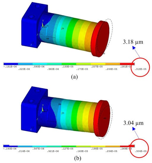 Firstly, the bending displacements of the vibrators under DC voltages are calculated through ANSYS software (Canonsburg, PA, USA) with static analysis. During the simulation, the material of the flange bolt is set as steel with a density of 7800 kg/m3, a Poisson’s ratio of 0.30, and a modulus of elasticity of 206 GPa; the material of the end cap is set as duralumin with a density of 2810 kg/m3, a Poisson ratio of 0.33, and a modulus of elasticity of 72 GPa; the PZT elements are set as PZT-4, the parameters of which are listed in Table 1. Fixed boundaries are applied on the top and bottom surfaces of the flange. The bending displacements of the driving foot in horizontal and vertical directions are calculated to be about 3.18 μm and 3.04 μm when DC voltages of 200 V are applied on the PZT-H and PZT-V, respectively, as shown in Figure 4.