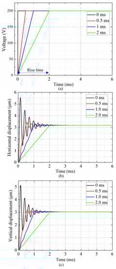 where αM represents mass damping, βK represents structural damping. The values of α and β are calculated from the modal damping ratio ξ and are required as input parameters for the analysis []. The modal damping ratio ξ used in the simulation is 0.03, which is obtained from the spectrum map tested by a scanning laser Doppler vibrometer (PSV-400M2, Polytec, Waldbronn, Germany). The transient responses of bending motions in horizontal and vertical directions under step signals with an amplitude of 200 V and rise times of 0 ms, 0.5 ms, 1.0 ms, and 2.0 ms are shown in Figure 5. The steady displacements of bending motions are calculated to be about 3.18 μm in horizontal direction and 3.04 μm in the vertical direction, which are identical to the static analysis results. Oscillations occur at the beginning of response processes and the oscillations decrease with the increase of the rise time of the excitation signal. Thus, the oscillations in the transient response processes can be significantly reduced by extending the rise time of the driving signal, which can make the motions of the driving feet more stable and reduce the slips between the driving feet and the rotor.