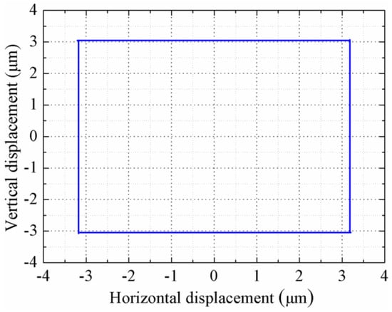 The horizontal and vertical steady displacements are calculated to be about 6.36 μm and 6.08 μm when two trapezoidal signals with a frequency of 1 Hz, an amplitude of 400 Vp-p, and a rise time of 5 ms are applied on the PZT-H and PZT-V, respectively. The motion trajectory of the driving foot is shown in Figure 6, it is obvious that the foot moves along a rectangular trajectory and there are slight oscillations when the voltage starts to change. It can be predicted that the rotor will be moved along the circumferential direction with 6.36 μm for each step.