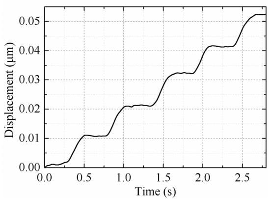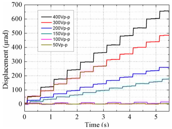Next, the output displacements of the rotor versus time under different voltages were measured, as shown in Figure 8, during which trapezoidal signals with a frequency of 1 Hz and rise time of 5 ms were used. The rotor is driven twice in one cycle, once by the DF-I and DF-III (Group I) simultaneously (the first step), and another by the DF-II and DF-IV (Group II) simultaneously (the second step). Due to the difference in driving feet’s step-displacements of each group, the step-displacement of the first step is determined by the DF-I with smaller step-displacement, which is approximately 6.27 μm. For the same reason, the step-displacement of the second step is approximately 6.43 μm. The overall average step-displacement is about 6.35 μm, which is consistent with the measured value of 6.32 μm (60.19 μrad). Figure 8 states that the step-displacement can be varied by changing the input voltages, and the rotor is moved with two steps in one cycle.