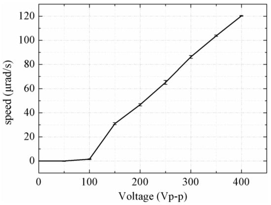 The rotor is pushed forward with retracement under a voltage of 100 Vp-p, and it is pushed forward step-by-step under a voltage of 150 Vp-p and above. The step-displacements under voltages of 150 Vp-p, 200 Vp-p and 300 Vp-p are about 1.15 μm, 2.43 μm and 4.55 μm, respectively. The speed versus the input voltage is plotted in Figure 9, and it can be seen that a maximum speed of 120.38 µrad/s is achieved under a voltage of 400 Vp-p. The rotor is in a reciprocating motion under input voltages of 50 Vp-p, as shown in Figure 8, which results in the rotor being unable to move macroscopically. The main reason of the reciprocating motion is that the driving feet cannot depart from the rotor completely under a voltage of 25 V (under the preload of 12 N); thus, the driving feet maintain contact with the rotor during the whole driving cycle; the forward displacement is nearly the same as the backward one under the horizontal voltage shown in Figure 3.