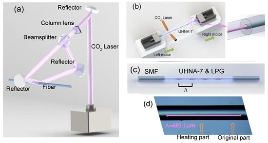 (a) The schematic illustration of the optical path in the LZM-100. (b) Formation of an LPFG on a UHNA-7 fiber with a CO2 laser splicer. (c) The structure of the LPFG on the UHNA-7 fiber. (d) The side image of the LPFG under a microscope.