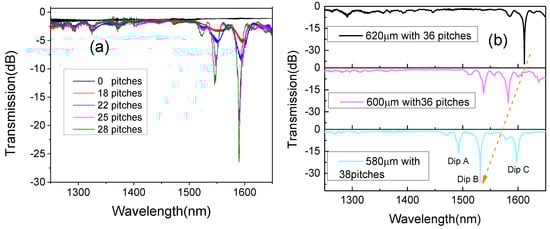 In Figure 2a, we can see that the center wavelength of the LPFG shifts to shorter wavelengths as the number of pitches increase during manufacture. The NA decreased as the Ge in the core diffused to the first cladding. As the number of pitches increases, the average RI of the core decreases, similar to what happens in type IIA fiber Bragg gratings [21], which means this kind of grating can be seen as a negative-RI grating. As a result, the effective RI decreases more for the fundamental mode than for the cladding mode. According to Equation (1), Δn decreases, which makes λ (the center wavelength of the LPFG) shift to shorter wavelengths: