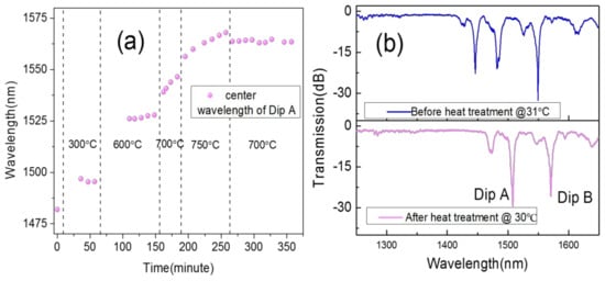 From Figure 3a, the center wavelength of the LPFG remains shifted to long wavelengths with time at a constant temperature (above 600 °C). We supposed that this was caused by the release of residual stress. The core of UHNA-7 was highly doped with Ge, which means that the melting point is much lower than the cladding. When the UHNA-7 is heated using the point-by-point method, the residual stress of the heated point can be released, but the residual stress of the unheated point still exists. Thus, when the UHNA-7 is under high temperature (above 600 °C), the release of residual stress at the unheated point will increase the average effective RI of the core [9]. From Equation (1), if the effective RI of the core increases, it causes the center wavelength to shift to longer wavelengths at a constant high temperature. Since the higher the temperature, the more residual stress is released, we wondered if we could make the residual stress release enough with post-processing.