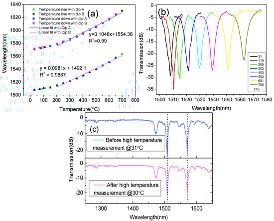 We used an LPFG that had gone through heat-treatment, and presented the spectrum shown in Figure 3b for high temperature. We raised the temperature by 50 °C every 20 min and recorded the center wavelength (red points in Figure 4a). Then we lowered the temperature step-by-step and, again, recorded the center wavelength (blue points in Figure 4a). We saw that the heating and cooling curves matched perfectly, which means that the LPFG can be used for repeated measurements. The change in the spectrum of the LPFG with increasing temperature is shown in Figure 4b. Due to the high concentration of Ge in the core, the high-temperature sensitivity of this kind of LPFG is higher than some conventional LPFGs. The whole curve looks more quadratic than linear, since the thermo-optic coefficients of Ge are not linear [23]. If we perform a linear fit within a range from 200 °C to 700 °C, we obtain a high-temperature sensitivity for the LPFG of 0.0981 nm/°C (Dip B) and 0.1045 nm/°C (Dip A). The two dips have a similar sensitivity to high temperature. After the LPFG was cooled to room temperature again, we compared the spectra of the LPFG before and after being used for high-temperature measurements, as shown in Figure 4c. There is no obvious change in the spectrum from the comparison, which is different from the changing spectrum during the previous heat treatment in Figure 3b. This means that the LPFG is able to withstand high temperatures and be used as a high-temperature sensor.