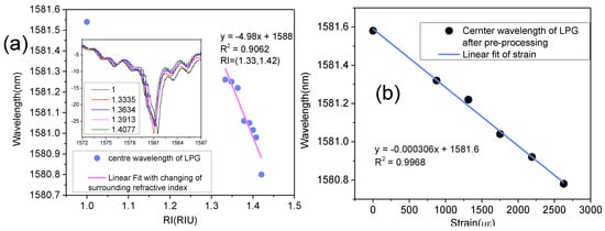 In addition, the LPFG’s response to the environment refractive index is shown in Figure 5a. The LPFG that is shown in Figure 5 has been used to measure high temperature. The RI sensitivity was –4.98 nm/RIU (RI is 1.333–1.420). When the surrounding RI changes from 1 to 1.42, the center wavelength of the LPFG only shifts within 0.8 nm, which is much smaller than the shift at high-temperature. Thus, we can say that this kind of LPFG is insensitive to RI, which is different from a conventional LPFG. The LPFG’s response to strain is shown in Figure 5b, the sensitivity is −0.306 pm/με, and the LPFG is not very sensitive to strain.