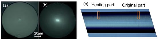 Cross-section of an (a) unheated and (b) heated UHNA-7 fiber, measured with a microscope. (c) Side image of LPFG which shows the heated and unheated part.