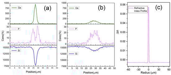 The Ge-diffusion of the core: Furthermore, to understand exactly how the elements changed after heating, we measured the element distribution on the UNHA-7 fiber with an electron probe microanalyzer. The distributions of the three fiber elements (Si, P, and Ge) are depicted in Figure 7. Before heating with the CO2 laser, the Ge is concentrated in the core area and there is a P-doped layer around the core, as shown in Figure 7a. Hence, we can regard the UHNA-7 as a double-cladding fiber in which the core is highly doped with Ge, the first cladding is doped with P, and the second cladding is composed of pure silica. Since the UHNA-7 fiber has a very high NA, the Ge content is also very high, which causes the distribution of Si to present a hollow in the core area. After being heated with the CO2 laser, the Ge-doped area exhibited a significant change, as can be seen in Figure 7b. The diameter of this area increased from 4 μm to about 15 μm, and the peak of the Ge distribution curve decreased significantly, which means that the NA of the fiber decreased as well. By our qualitative calculation, the concentration of Ge in the processed fiber’s core dropped by over half in the fiber, which was before processing. This means that the effect on the RI change was on the order of 10−2 to 10−3. In a conventional LPFG, which is made by periodical tapering, the effect on the RI change caused by the changing of the fiber structure is on the order of 10−4 (unfortunately, due to equipment limitations, we are unable to obtain quantitative changes of Ge concentration at present).