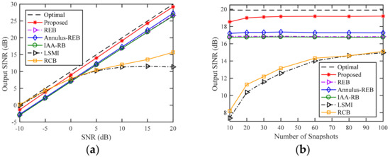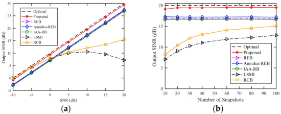 In the following numerical examples, a 10-sensor uniform linear array spaced half-wavelength is considered, and we assume that the sensors are calibrated, which are free of gain-phase errors. Two interferences, both with interference-to-noise ratios (INR) fixed at 20 dB, impinge from and . The desired signal impinges from . The desired signal and interferences are generated from zero means complex Gaussian noises and therefore spatially and temporally independent. In the case of SINR versus SNR, the number of snapshots is fixed at K = 30, and in the case of SINR versus snapshots number, the SNR is fixed at 10 dB.