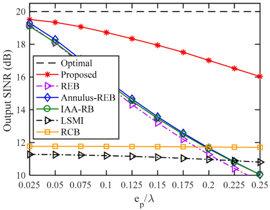 In this sub-section, we investigate the influence of sensor displacement on the performance of the proposed beamformer. The position errors of the sensors (except the first one) are uniformly distributed in the interval , where is the upper boundary. The SNR is fixed at 10 dB, and Figure 4 shows that with the increase of sensor position errors, the output SINR of RCB and LSMI stay at nearly 12 dB and 11 dB, respectively. The performances of all INCM-based beamformers deteriorate as sensor position errors increase. When the sensor position error boundary is larger than , REB, Annulus–REB, and IAA–RB perform worse than the SCM-based adaptive beamformers. However, with estimated sensor position errors, the proposed WSF–REB mitigate the performance degradation caused by sensor displacement, even when the upper boundary is up to (half of assumed sensor spacing), the proposed beamformer can still provide an output SINR of 16 dB, while the output SINRs of REB, Annulus-REB and IAA-RB are only nearly 10 dB.