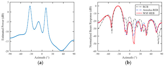 To explore the performance of the tested beamformers in the case of sensor displacement, the nominal SVs used to calculate the weight vector are calculated by using assumed sensor positions, which are obtained by adding slight position errors on the actual sensor positions. In Figure 6a, we estimate the Capon power spectrum for the proposed WSF–REB, the estimated DOAs of desired signal and interferences are , , , and the position errors in Figure 6 are listed in Table 3.