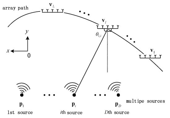 We assume that there are stationary narrowband targets transmitting plane waves to the measuring station, and corresponding locations of the target signals are , . Thus, the location vector of the (uncorrelated) source targets can be expressed as , and the sources are uncorrelated to each other. The receiving array at the observation station uses coprime array with sensors. All receiving sensors are omnidirectional antennas and have good phase consistency. According to the characteristics of the array, assume , the observation station moved positions during measurement, the observation position is , and the number of snapshot at each observation position is . The movement of the station is sufficiently slow that we can assume the channel environment does not change during measurements at the same observation position, and Doppler shift is not generated in this process. The received signal vector represents the received snapshot at the observation position. Geometry of one moving antenna array and multiple transmitters is shown in Figure 1.
