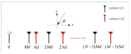 According to the sensor distance in each subarray, we can obtain the self-difference , and the cross-difference of the two sparse arrays. These differences represent the relative position of any two elements, and form the basis of a virtual array. The detailed concept of a virtual array is discussed in References [3,4,17,19]. The self-differences and cross-difference are calculated as