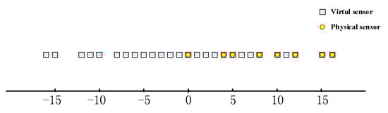 According to (6)–(8), the virtual array structure will be obtained by removing repeated virtual array sensors. For and , the real sensors of subarrays are those with numbers and , respectively, and the virtual sensor locations are . The distribution of physical array sensors and virtual array sensors are shown in Figure 3. Obviously, coprime array structure has an increased array aperture and greater array DOF.