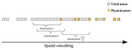 We apply spatial smoothing to , as shown in Figure 4, and has a conjugate symmetric distribution, so we set the length of the continuous virtual array to , and take the length of the smooth segment to be . The position of the smooth subarray is , and the noise vector is . For the virtual array