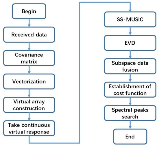 - Vectorize the covariance matrix of each observation position, and then construct the virtual array model based on the continuous virtual response using Equations (21)–(24).