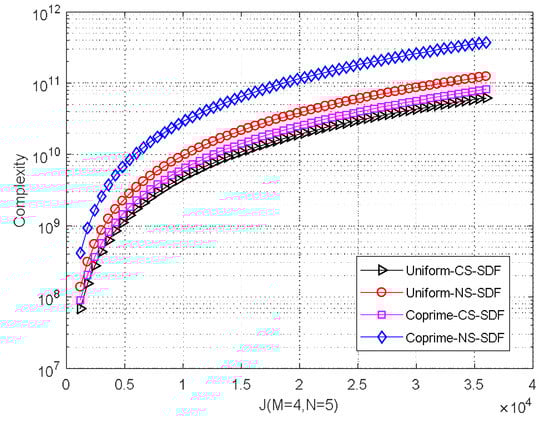 Complexity comparison with different grid number. Uniform-CS-SDF: SDF for CS based on uniform array; Uniform-NS-SDF: SDF for NS based on uniform array; Coprime-CS-SDF (proposed): SDF for CS based on coprime array; Coprime-NS-SDF (proposed): SDF for NS based on coprime array.