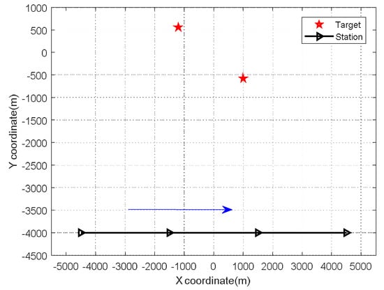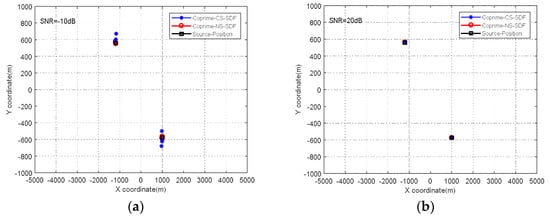 In this experiment, the observation positions were (−4500, −4000), (−1500, −4000), (1500, −4000), and (4500, −4000), and the trajectory of the station movement in relation to the target sources, was as shown in Figure 7. To verify the performance of the proposed algorithm under different noise levels, we applied the MCA-DPD algorithm with SNRs of −10 dB and 20 dB. The simulation results in Figure 8 show that, for both CS and NS, MCA-DPD achieves better estimation performance with higher SNR, and can effectively estimate the locations of source targets at lower SNR.