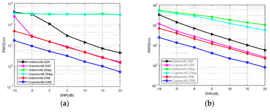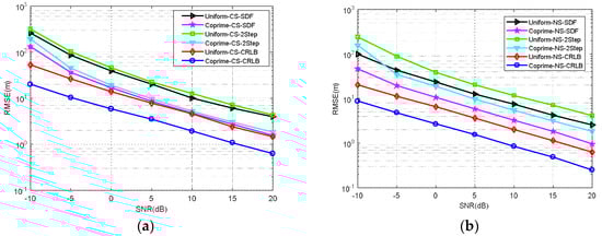 This simulation measured the RMSE of SDF, two-step localization, and MCA-DPD. The estimation performance of two-step localization based on the coprime array, and the CRLB based on a uniform linear array and the coprime array, was also examined. Figure 9a shows the results from the SDF algorithm, with a uniform array and MCA-DPD, the two-step positioning performance, and the CRLB comparison for the CS case. Figure 9b compares the performance of these methods for the NS case. When SNR = 0 dB, the positioning accuracy improves by ~20 m in the NS case, and when SNR = 20 dB, the positioning accuracy improves by ~2 m. The two-step localization algorithm is less accurate than DPD under the same simulation conditions, and the coprime array model is more accurate than the uniform array model in the same location algorithm. Furthermore, the CRLB of the coprime array model is obviously lower than that of the uniform linear array. The positioning accuracy is effectively improved by the use of the coprime array in both two-step localization and SDF.