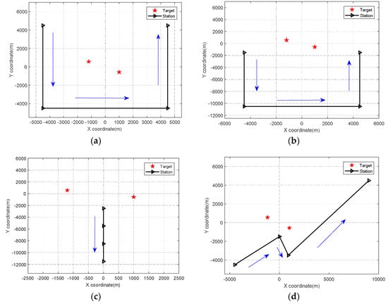 The observation position is another important factor affecting the RMSE of position determination. In this simulation, the RMSE performance was examined under four typical trajectories (see Figure 11). The results are shown in Figure 12. From the simulation results, we can see that two-step localization is more sensitive than DPD to the observation location, and the RMSE performance of MCA-DPD varies according to the trajectory, as does the CRLB. This is because the array manifold in the CRLB expression contains the location information of the observation station. Thus, the RMSE performance is affected by the observation position. The estimation accuracy is also affected by the direction of arrival to the linear array in the two-step localization algorithm. Generally, a direction of arrival closer to the normal results in higher accuracy. The MCA-DPD algorithm is also established on the basis of this angle, as in Equation (4), so the RMSE of the proposed method is affected by the observation position.