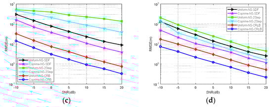 The number of snapshots is an important factor in the positioning accuracy. This simulation compared the performance of MCA-DPD, two-step localization, SDF, and CRLB for CS and NS under a uniform array and coprime array, with different numbers of snapshots and SNR = −10 dB. Figure 10 shows that, as the number of snapshots increases, the RMSE performance effectively improves in both the CS and NS cases. DPD outperforms two-step localization for the same array model, and the coprime array is better than the uniform array for each positioning algorithm.