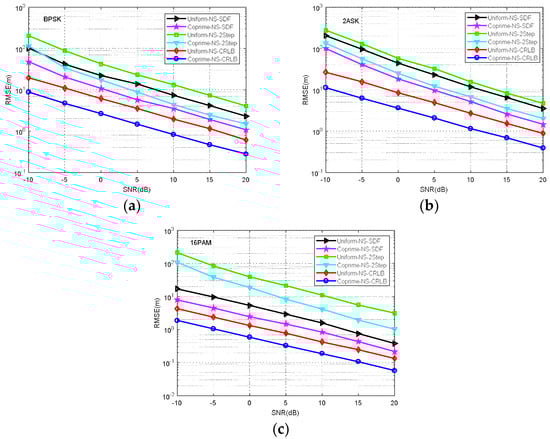 The signal modulation is known to affect the positioning accuracy. To verify the influence of different modulation signals, we compared the algorithms’ performance under three typical modulation signals (BPSK, ASK, 16PAM) in the NS case. The results in Figure 13 show that the RMSE performance varies according to the modulation signal, as does the CRLB.