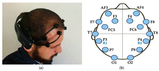 Emotiv EPOC® wireless EEG headset: (a) Placement of the device on the head of the subject; (b) Distribution of the electrodes according to the international 10–20 system.