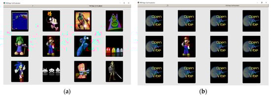 Matrix of images used to obtain P300 evoked potentials: (a) At the beginning of the experiment, all the images are displayed; and (b) during the development of the experiment, the images are hidden and appear randomly one by one.
