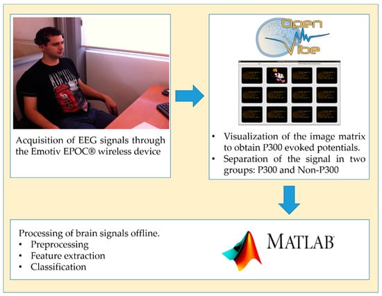 At the beginning of each trial, the subject was asked to focus his attention on a particular image. Then, these images began to appear and disappear at random. In one trial each image appeared 12 times with a fixed time of 200 ms. There was a recess period of 100 ms between each image. The complete experiment consisted of six trials, in total, and each image of the matrix appeared 72 times. This means that each subject generated a total of 72 evoked potentials. Each participant was asked not to blink or perform eye movements as much as possible to avoid generating noise in the EEG signal. In a previous work [], this same method of P300 evoked potential acquisition was used and obtained excellent results. The complete EEG signal was acquired during an online process through the OpenViBE® software. Then, in an offline process, the OpenViBE® software was used again to divide the signal into two groups. In Group 1 the signals were related to P300 type events, and in Group 2 the signals were not related to this type of event. To obtain Group 1, samples of the EEG signal were taken (epochs of 700 ms) at each instant that the target image was presented. The rest of the signal was considered Group 2. Then, the data was stored for offline processing with Matlab® software version R2012a. Figure 3 shows the complete process of the BCI system development.