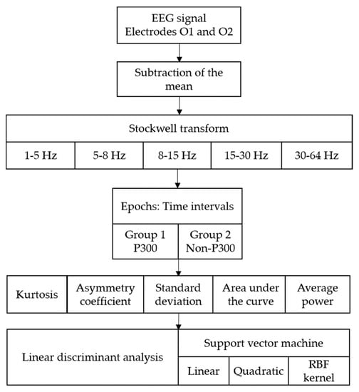 The test vector was formed with samples of type P300 and non-P300 distributed alternately (10 segments of 5 s). It was used to verify the efficiency of the classifier. The performance was established according to the number of samples correctly classified in the P300 and non-P300 groups with the LDA and SVM classifiers. The kernel functions used in the SVM were linear, quadratic, and radial basis. In the Gaussian radial base kernel function (RBF), a scale factor (sigma) of 1 and a penalty parameter (C) of 1 were used. The complete methodology with the different algorithms used in this study is shown in Figure 4.